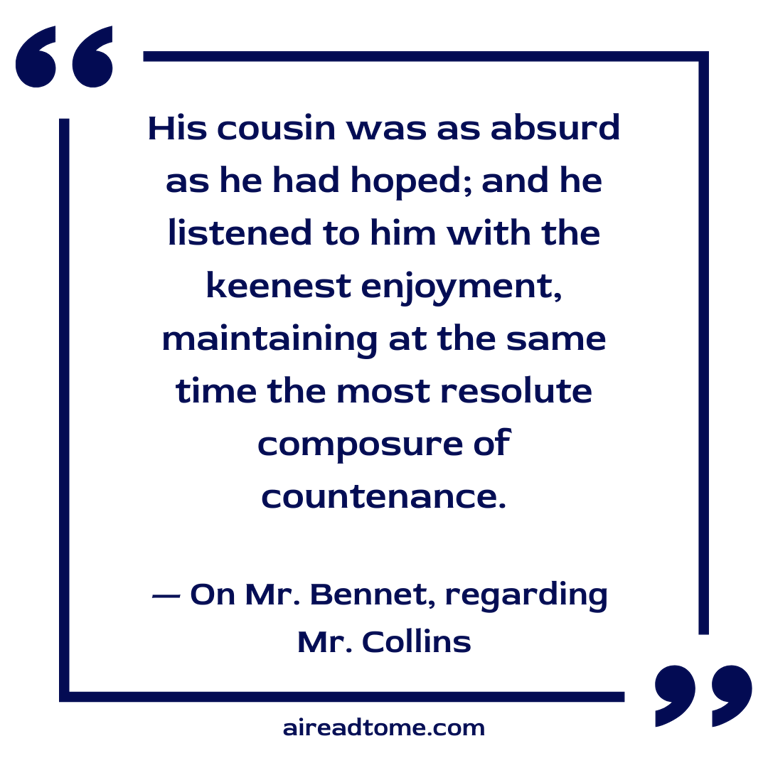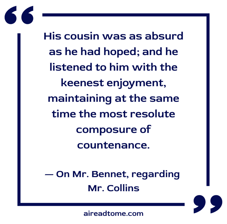 Mr. Bennet’s expectations were fully answered. His cousin was as absurd as he had hoped; and he listened to him with the keenest enjoyment, maintaining at the same time the most resolute composure of countenance, and, except in an occasional glance at Elizabeth, requiring no partner in his pleasure.