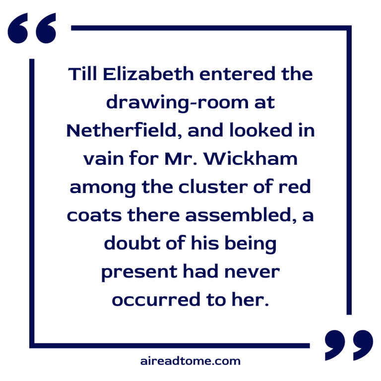 Till Elizabeth entered the drawing-room at Netherfield, and looked in vain for Mr. Wickham among the cluster of red coats there assembled, a doubt of his being present had never occurred to her.