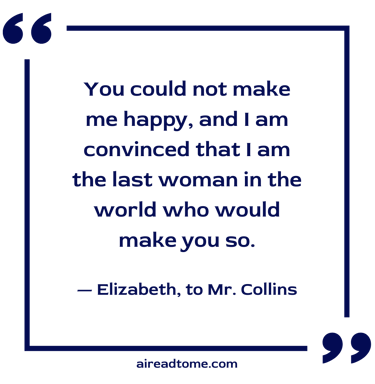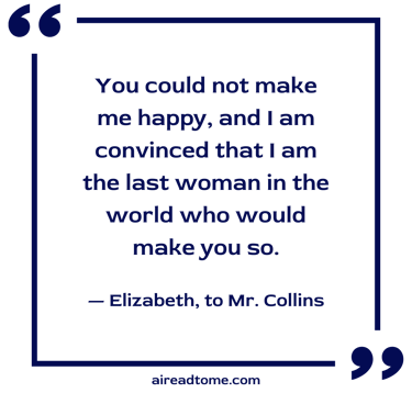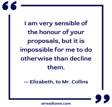 “Indeed, Mr. Collins, all praise of me will be unnecessary. You must give me leave to judge for myself, and pay me the compliment of believing what I say. I wish you very happy and very rich, and by refusing your hand, do all in my power to prevent your being otherwise. In making me the offer, you must have satisfied the delicacy of your feelings with regard to my family, and may take possession of Longbourn estate whenever it falls, without any self-reproach. This matter may be considered, therefore, as finally settled.” And rising as she thus spoke, she would have quitted the room, had not Mr. Collins thus addressed her,—