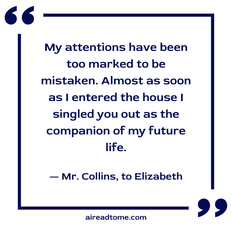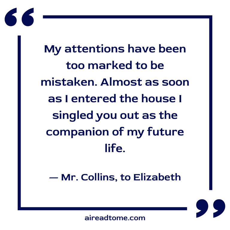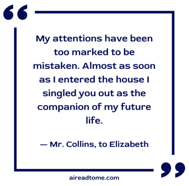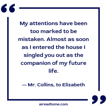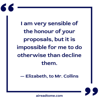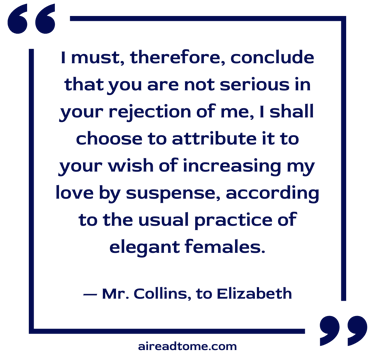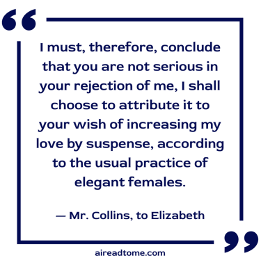 “You must give me leave to flatter myself, my dear cousin, that your refusal of my addresses are merely words of course. My reasons for believing it are briefly these:—It does not appear to me that my hand is unworthy your acceptance, or that the establishment I can offer would be any other than highly desirable. My situation in life, my connections with the family of De Bourgh, and my relationship to your own, are circumstances highly in my favour; and you should take it into further consideration that, in spite of your manifold attractions, it is by no means certain that another offer of marriage may ever be made you. Your portion is unhappily so small, that it will in all likelihood undo the effects of your loveliness and amiable qualifications. As I must, therefore, conclude that you are not serious in your rejection of me, I shall choose to attribute it to your wish of increasing my love by suspense, according to the usual practice of elegant females.”