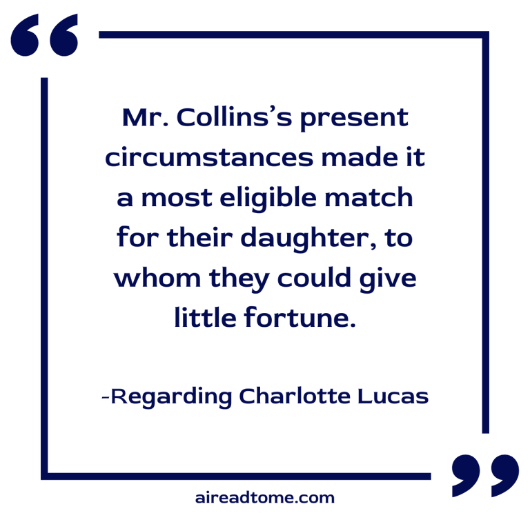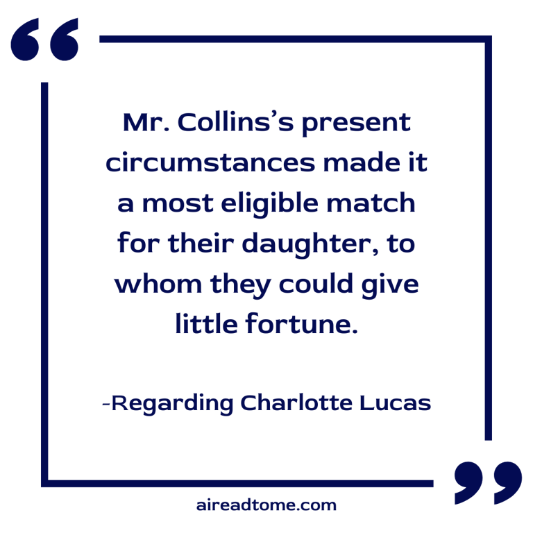 Sir William and Lady Lucas were speedily applied to for their consent; and it was bestowed with a most joyful alacrity. Mr. Collins’s present circumstances made it a most eligible match for their daughter, to whom they could give little fortune; and his prospects of future wealth were exceedingly fair.