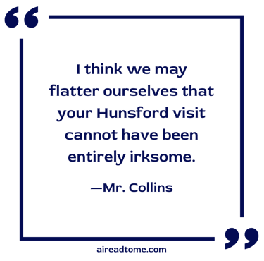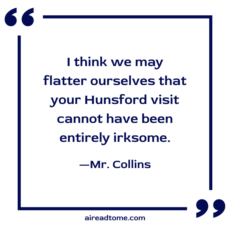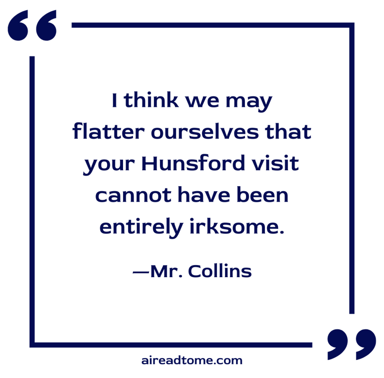 “It gives me the greatest pleasure to hear that you have passed your time not disagreeably. We have certainly done our best; and most fortunately having it in our power to introduce you to very superior society, and from our connection with Rosings, the frequent means of varying the humble home scene, I think we may flatter ourselves that your Hunsford visit cannot have been entirely irksome.