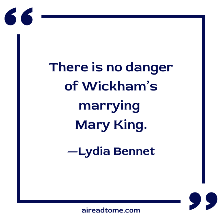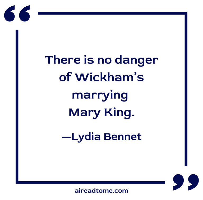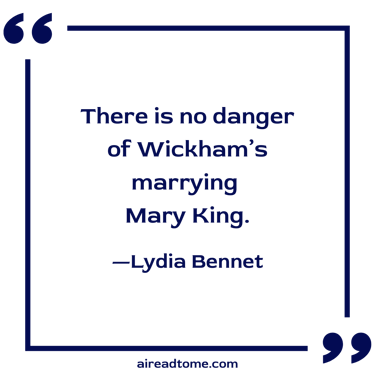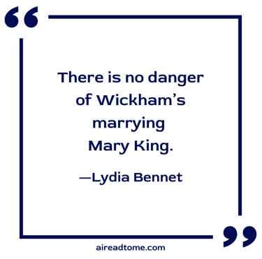 “Ay, that is just like your formality and discretion. You thought the waiter must not hear, as if he cared! I dare say he often hears worse things said than I am going to say. But he is an ugly fellow! I am glad he is gone. I never saw such a long chin in my life. Well, but now for my news: it is about dear Wickham; too good for the waiter, is not it? There is no danger of Wickham’s marrying Mary King—there’s for you! She is gone down to her uncle at Liverpool; gone to stay. Wickham is safe.”
