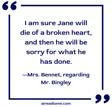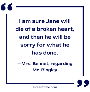 “Well, Lizzy,” said Mrs. Bennet, one day, “what is your opinion now of this sad business of Jane’s? For my part, I am determined never to speak of it again to anybody. I told my sister Philips so the other day. But I cannot find out that Jane saw anything of him in London. Well, he is a very undeserving young man—and I do not suppose there is the least chance in the world of her ever getting him now. There is no talk of his coming to Netherfield again in the summer; and I have inquired of everybody, too, who is likely to know.”