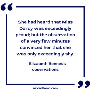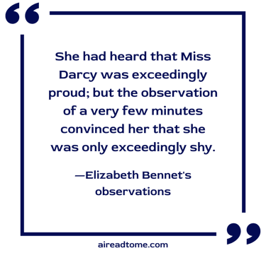 With astonishment did Elizabeth see that her new acquaintance was at least as much embarrassed as herself. Since her being at Lambton, she had heard that Miss Darcy was exceedingly proud; but the observation of a very few minutes convinced her that she was only exceedingly shy. She found it difficult to obtain even a word from her beyond a monosyllable.