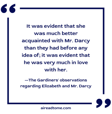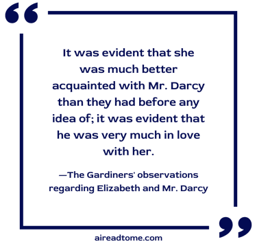 To Mr. and Mrs. Gardiner he was scarcely a less interesting personage than to herself. They had long wished to see him. The whole party before them, indeed, excited a lively attention. The suspicions which had just arisen of Mr. Darcy and their niece, directed their observation towards each with an earnest, though guarded, inquiry; and they soon drew from those inquiries the full conviction that one of them at least knew what it was to love. Of the lady’s sensations they remained a little in doubt; but that the gentleman was overflowing with admiration was evident enough.