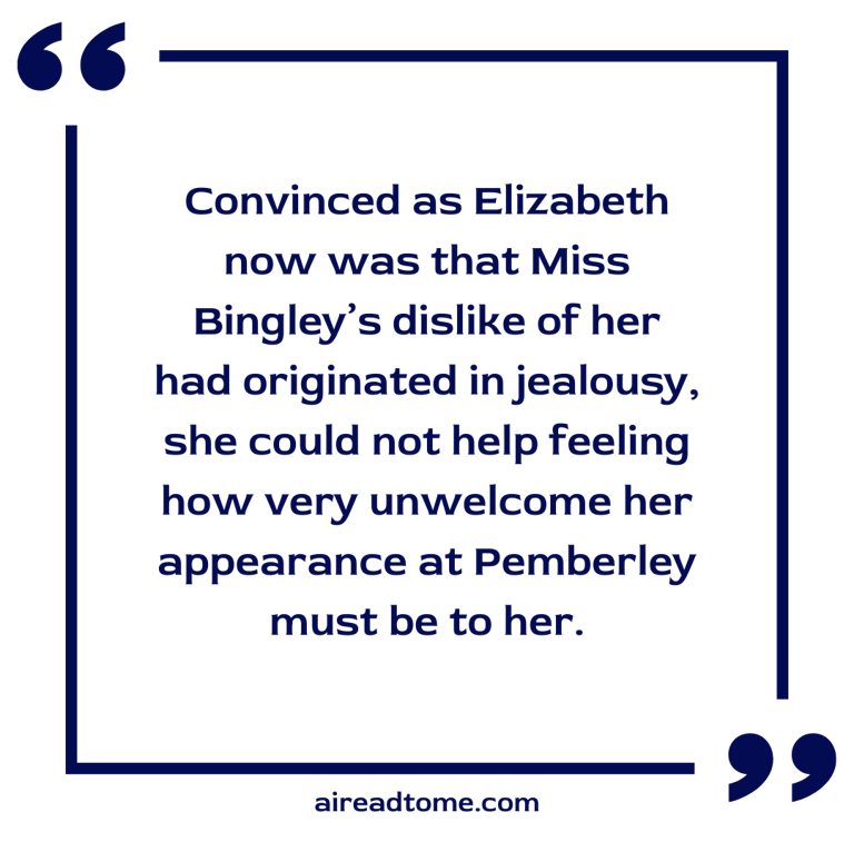Convinced as Elizabeth now was that Miss Bingley’s dislike of her had originated in jealousy, she could not help feeling how very unwelcome her appearance at Pemberley must be to her, and was curious to know with how much civility on that lady’s side the acquaintance would now be renewed.