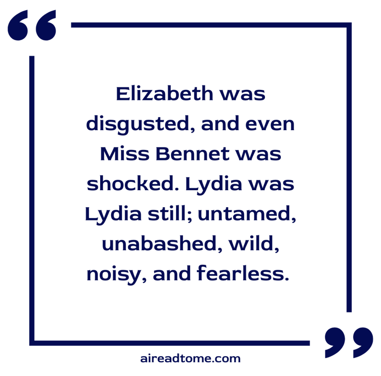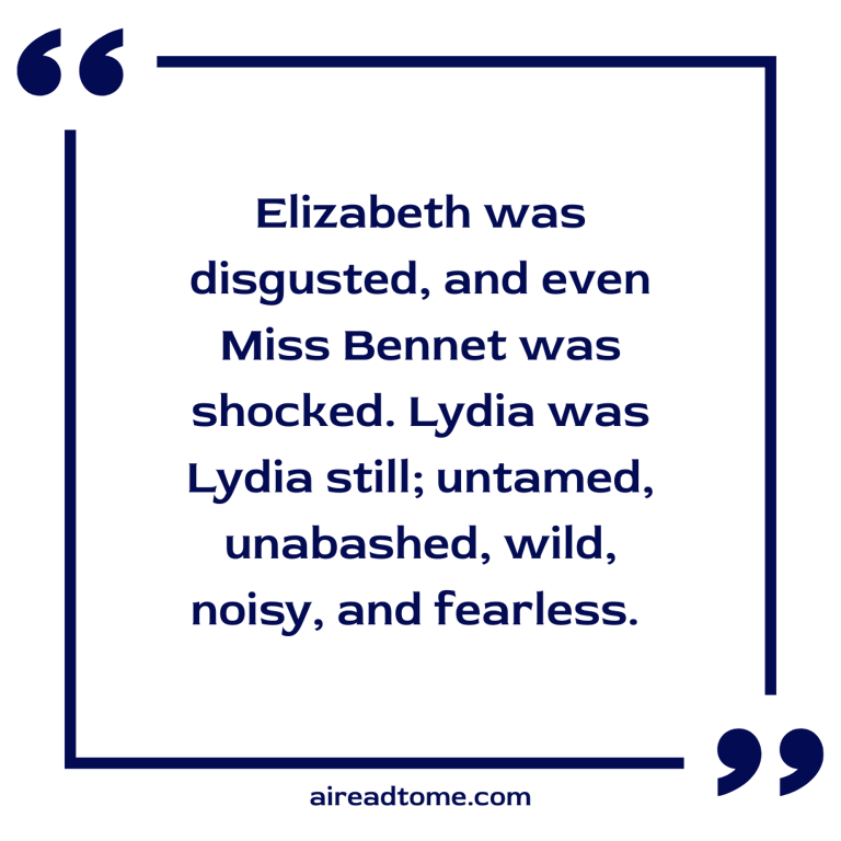 Elizabeth was disgusted, and even Miss Bennet was shocked. Lydia was Lydia still; untamed, unabashed, wild, noisy, and fearless. She turned from sister to sister, demanding their congratulations; and when at length they all sat down, looked eagerly round the room, took notice of some little alteration in it, and observed, with a laugh, that it was a great while since she had been there.