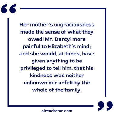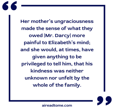 His behaviour to her sister was such during dinnertime as showed an admiration of her, which, though more guarded than formerly, persuaded Elizabeth, that, if left wholly to himself, Jane’s happiness, and his own, would be speedily secured. Though she dared not depend upon the consequence, she yet received pleasure from observing his behaviour. It gave her all the animation that her spirits could boast; for she was in no cheerful humour. Mr. Darcy was almost as far from her as the table could divide them. He was on one side of her mother. She knew how little such a situation would give pleasure to either, or make either appear to advantage. She was not near enough to hear any of their discourse; but she could see how seldom they spoke to each other, and how formal and cold was their manner whenever they did. Her mother’s ungraciousness made the sense of what they owed him more painful to Elizabeth’s mind; and she would, at times, have given anything to be privileged to tell him, that his kindness was neither unknown nor unfelt by the whole of the family.