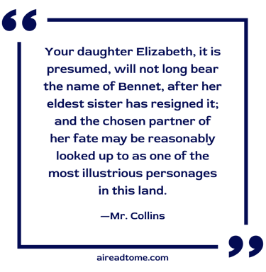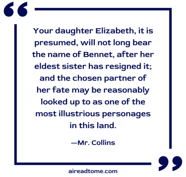 “Something very much to the purpose, of course. He begins with congratulations on the approaching nuptials of my eldest daughter, of which, it seems, he has been told by some of the good-natured, gossiping Lucases. I shall not sport with your impatience by reading what he says on that point. What relates to yourself is as follows:—‘Having thus offered you the sincere congratulations of Mrs. Collins and myself on this happy event, let me now add a short hint on the subject of another, of which we have been advertised by the same authority. Your daughter Elizabeth, it is presumed, will not long bear the name of Bennet, after her eldest sister has resigned it; and the chosen partner of her fate may be reasonably looked up to as one of the most illustrious personages in this land.’