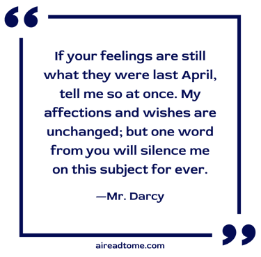 Elizabeth was too much embarrassed to say a word. After a short pause, her companion added, “You are too generous to trifle with me. If your feelings are still what they were last April, tell me so at once. My affections and wishes are unchanged; but one word from you will silence me on this subject for ever.”