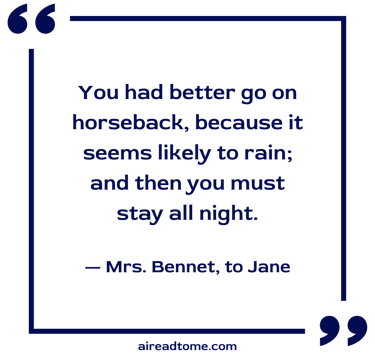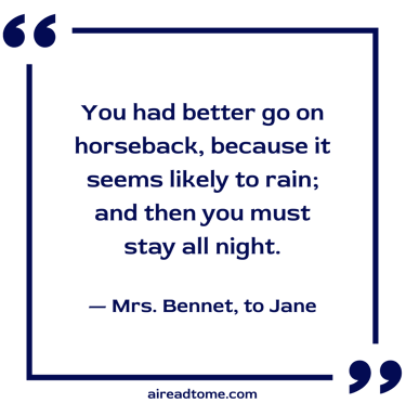 She did at last extort from her father an acknowledgment that the horses were engaged; Jane was therefore obliged to go on horseback, and her mother attended her to the door with many cheerful prognostics of a bad day. Her hopes were answered; Jane had not been gone long before it rained hard. Her sisters were uneasy for her, but her mother was delighted. The rain continued the whole evening without intermission; Jane certainly could not come back.