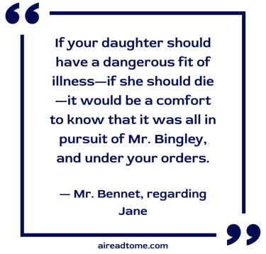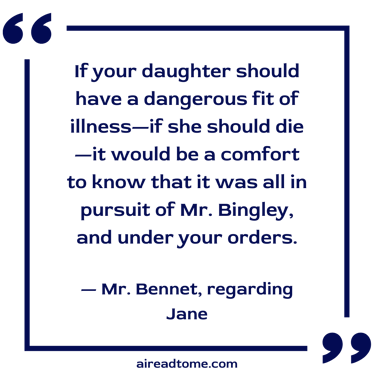 “Well, my dear,” said Mr. Bennet, when Elizabeth had read the note aloud, “if your daughter should have a dangerous fit of illness—if she should die—it would be a comfort to know that it was all in pursuit of Mr. Bingley, and under your orders.”